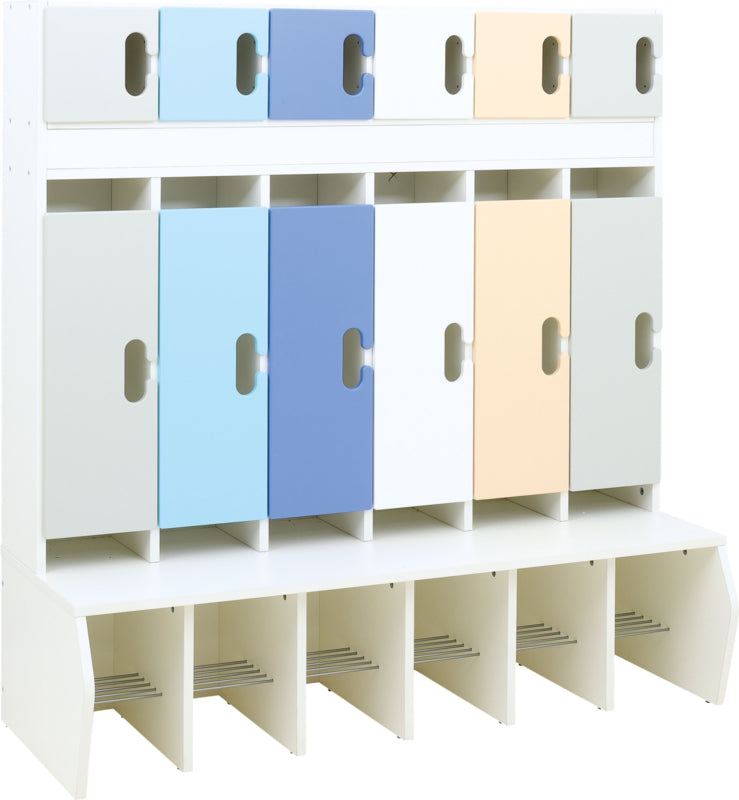 Garderobe voor 6 kinderen gemaakt van gelamineerd spaanplaat in een esdoorn kleur of wit. Metalen haken zijn inbegrepen.