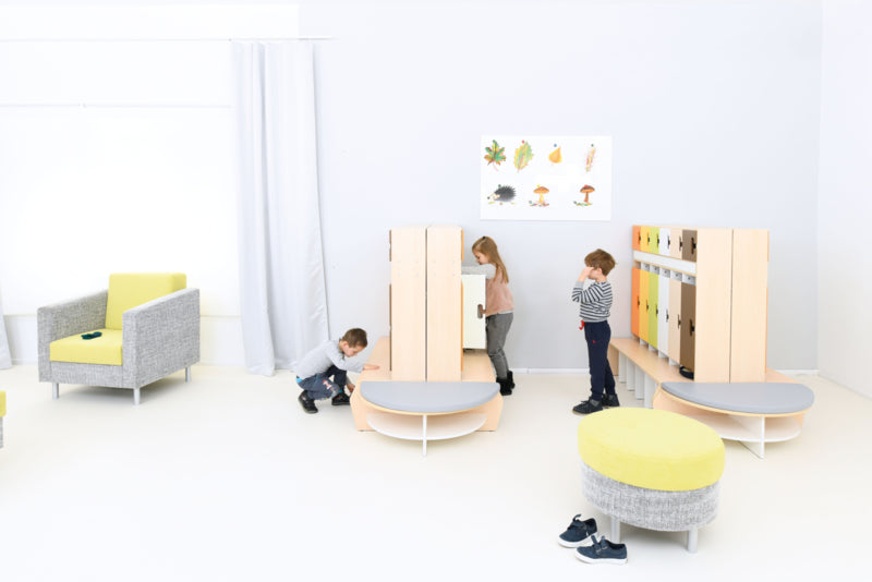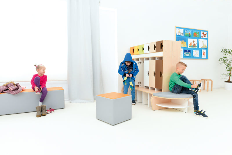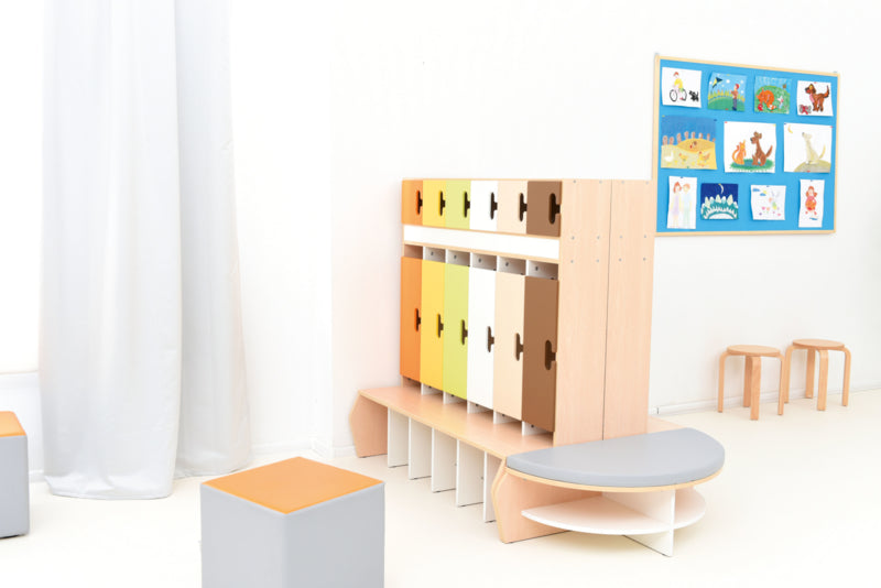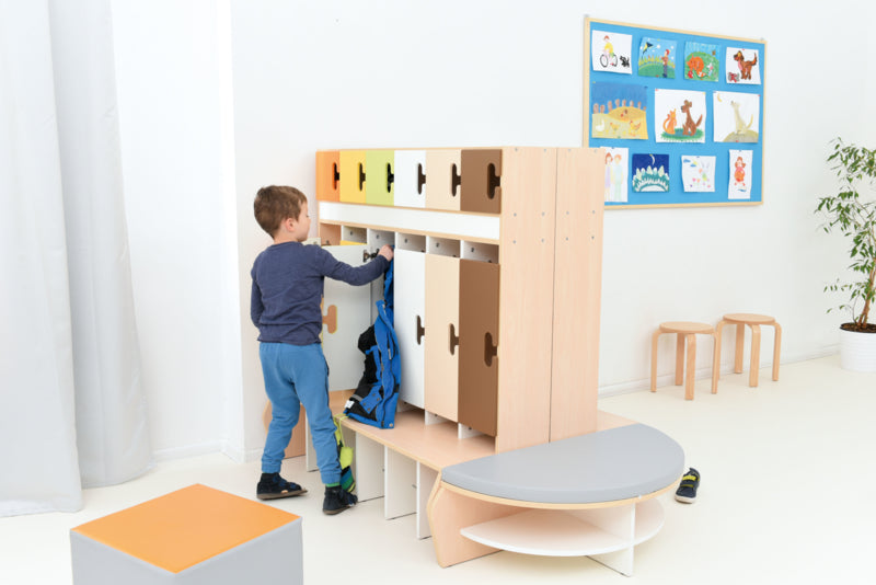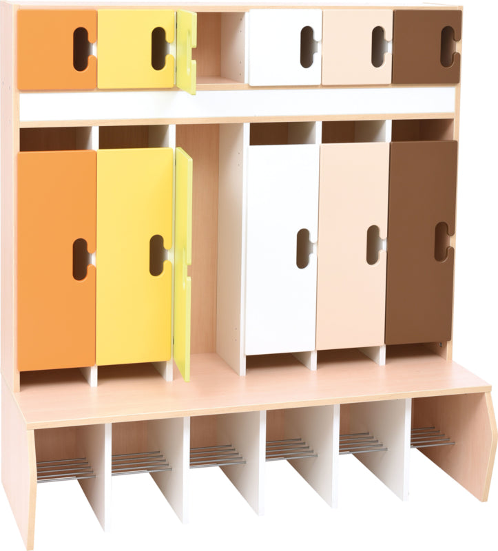 Garderobe voor 6 kinderen gemaakt van gelamineerd spaanplaat in een esdoorn kleur of wit. Metalen haken zijn inbegrepen.