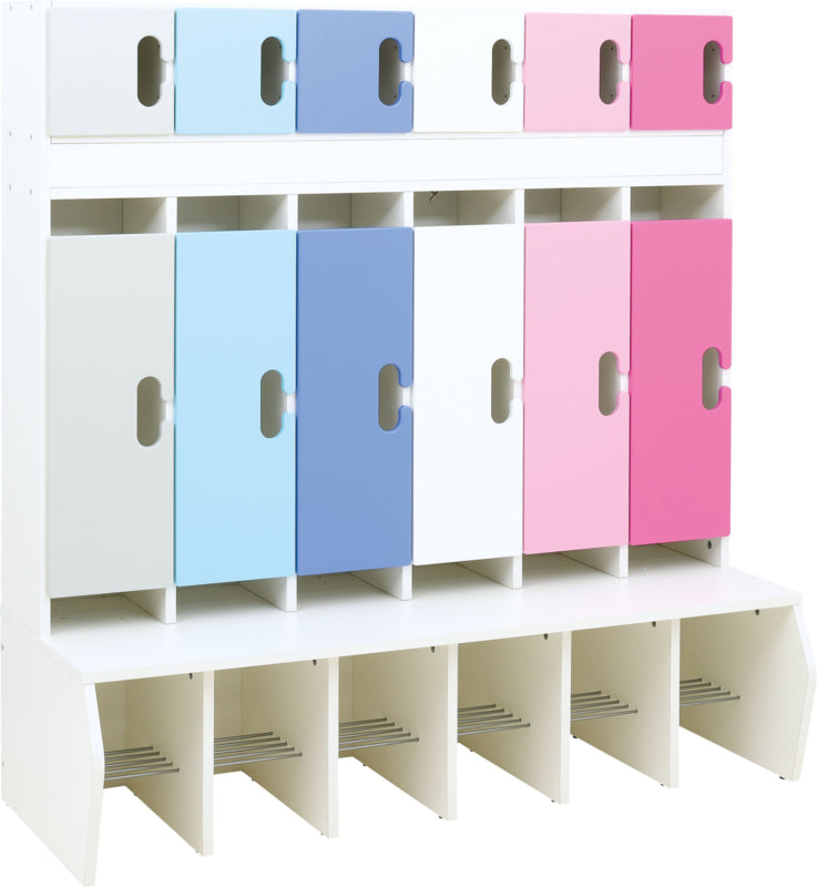 Garderobe voor 6 kinderen gemaakt van gelamineerd spaanplaat in een esdoorn kleur of wit. Metalen haken zijn inbegrepen.