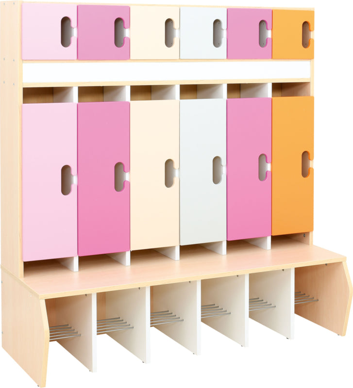 Garderobe voor 6 kinderen gemaakt van gelamineerd spaanplaat in een esdoorn kleur of wit. Metalen haken zijn inbegrepen.