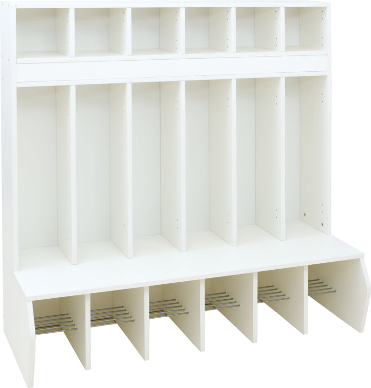 Garderobe voor 6 kinderen gemaakt van gelamineerd spaanplaat in een esdoorn kleur of wit. Metalen haken zijn inbegrepen.