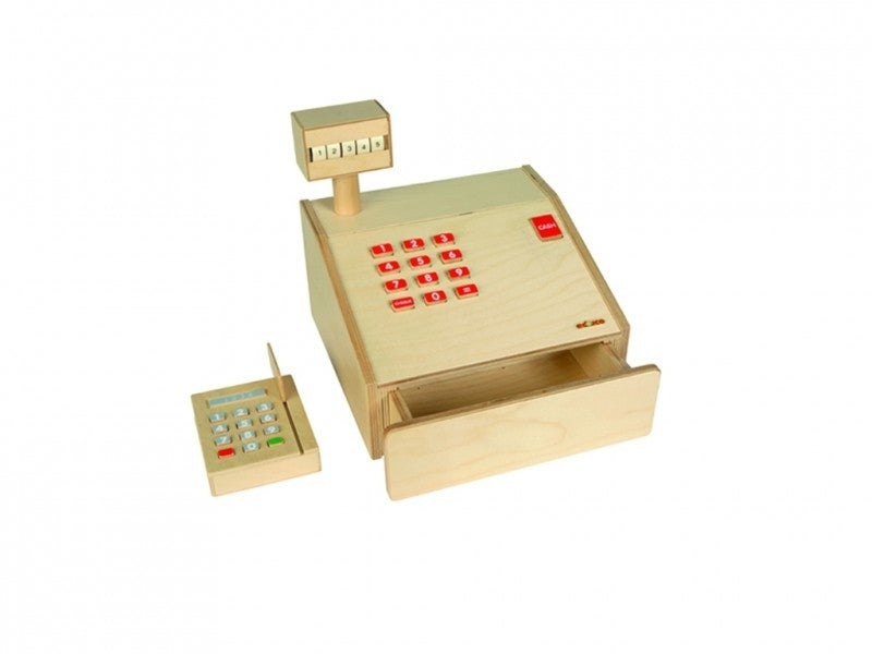 Een kassa uitgevoerd met druktoetsen en kassalade met pinautomaat en pinpas. De kassa heeft de afmeting 24 x 24 x 13 cm (l x b x h) en is geschikt voor kinderen vanaf 3 jaar.