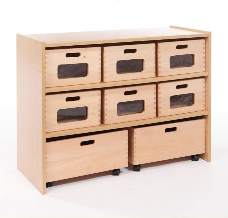 Met 6 massief houten bakken met plexiglas en 2 rolkisten.