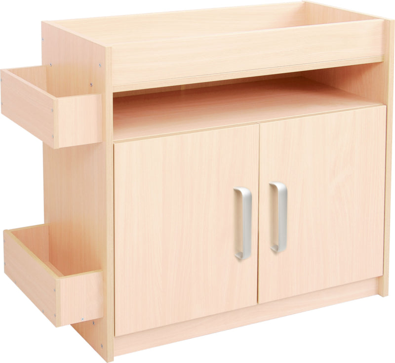 Met plank en deuren in onderste deel. Bovenste gedeelte is perfect voor het opbergen van verf, penselen en andere materialen (met gemakkelijke toegang voor kinderen).