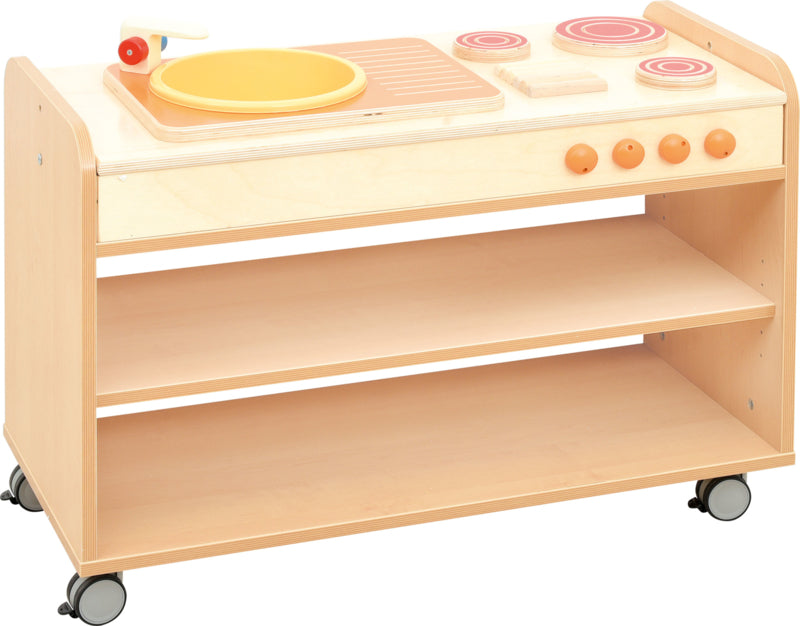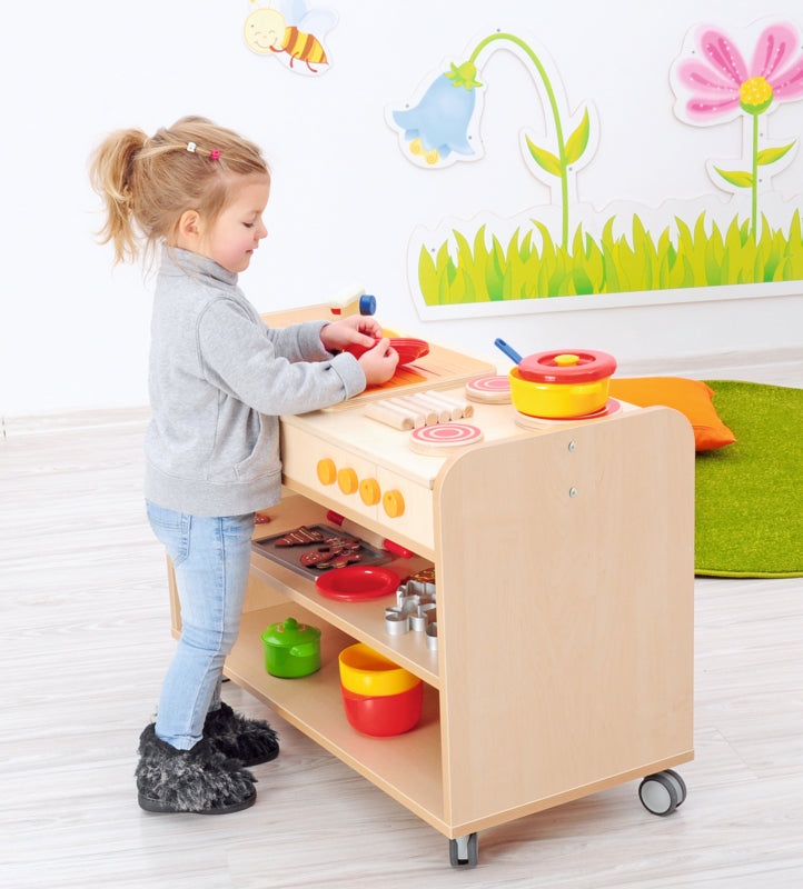 Flexi keuken kast zijn er om de thuissituatie na te spelen,wat groepsintegratie ontwikkelt. Kinderen communiceren en werken samen tijdens dit fanasiespel.
