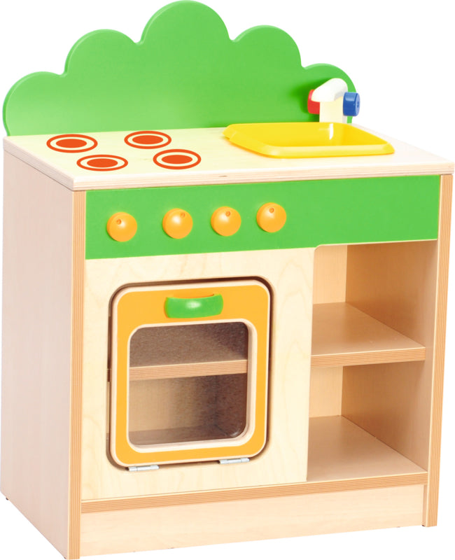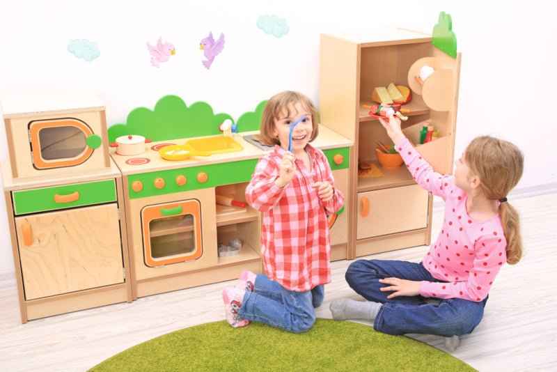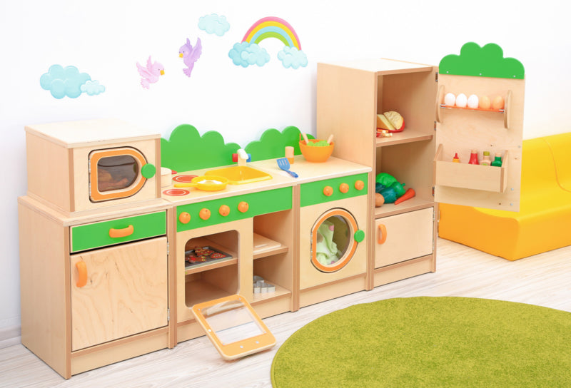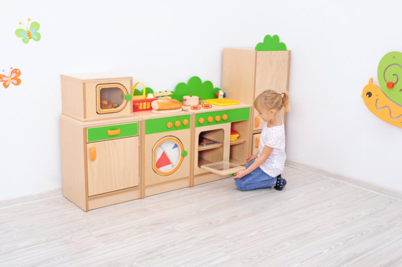 Speelhoek Hania bestaat uit koelkast, fornuis met spoelbak , wasmachine en kast met magnetron. Elk element wordt afzonderlijk verkocht, waardoor individuele combinaties kunnen worden gemaakt. Gemaakt van gelamineerd spaanplaat en kleurrijke mdf-platen.