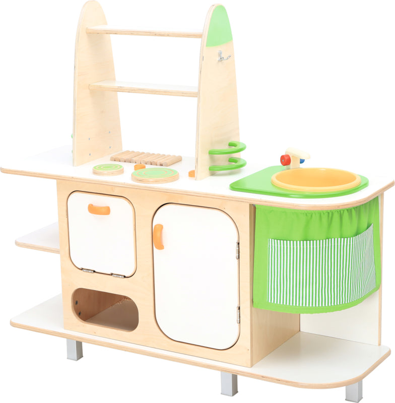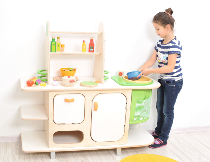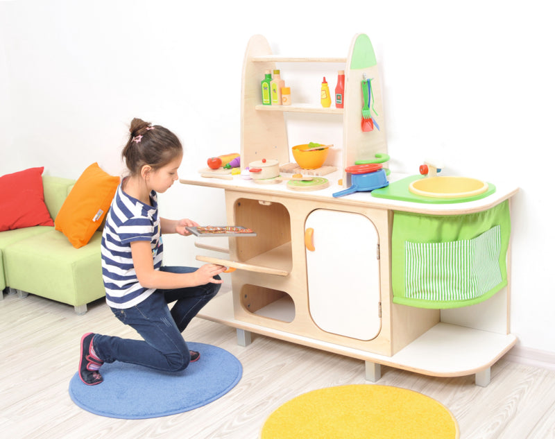 Moderne keuken in trendy kleuren, gemaakt van multiplex. Het is uitgerust met een kast met deur, spoelbak, oven, kookplaat en tal van planken, hangers en steunen voor bestek.