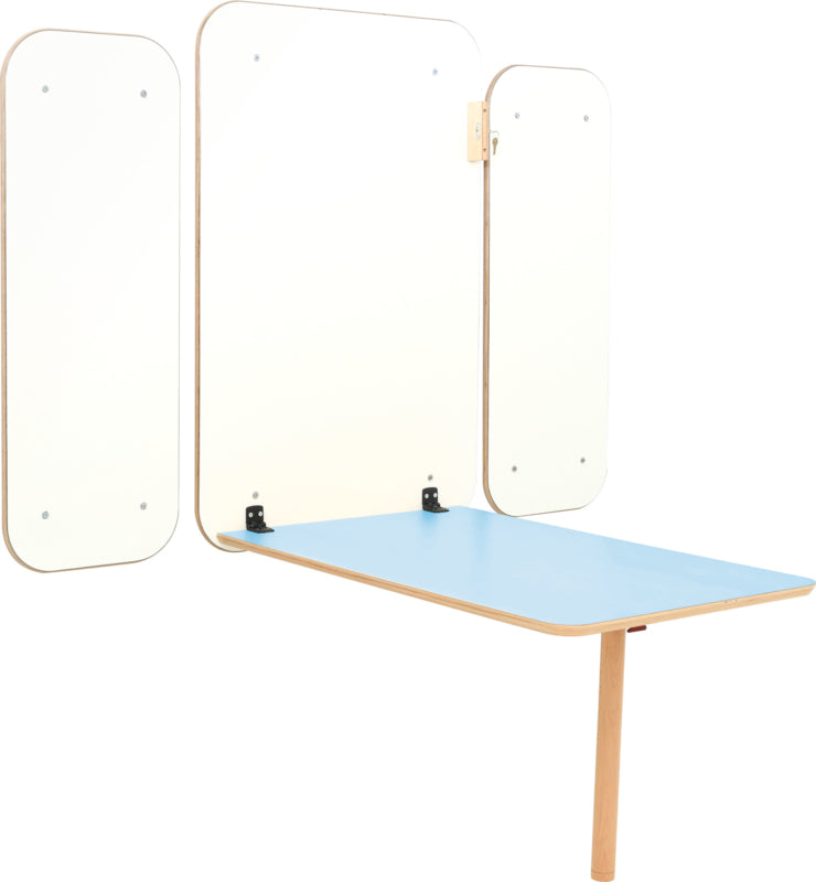 Een ruimtebesparend alternatief voor traditionele tafels. Het tafelblad wordt op een op de muur geschroefde plaat gemonteerd en indien gewenst gevouwen. Blad is vergrendeld met de sleutel, zodat het niet onverwachts kan worden geopend. De gevouwen poot wordt met een grendel aan de tafel bevestigd. Nadat het tafelblad is uitgevouwen, dient de magnetische muurplaat als een bord waarop u met stift kunt schrijven. Het tafelblad kan op een wandplaat op 4 hoogten worden gemonteerd en de tafelpootlengte wordt dienovereenkomstig verhoogd.