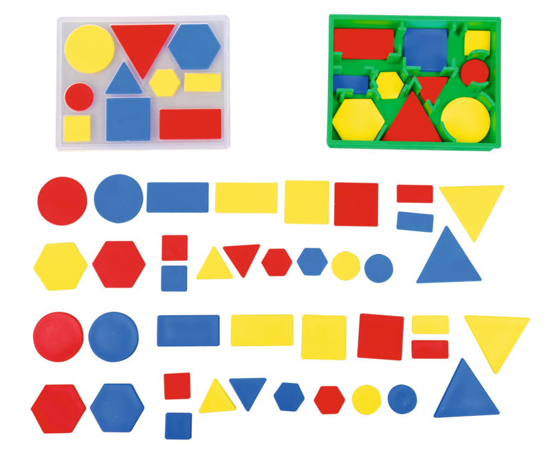 5 vormen (zeshoeken, vierkanten, driehoeken, rechthoeken en cirkels). Totaal 60 stuks.