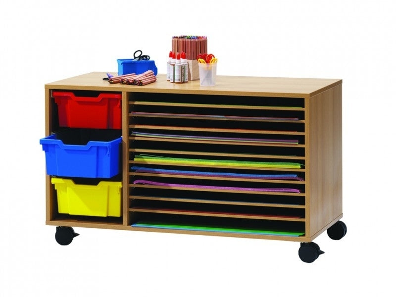 Met 11 papiervakken van ca. 5 cm. hoog voor papiervellen van 50 x 70 cm.