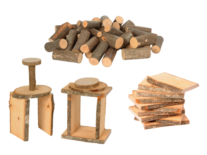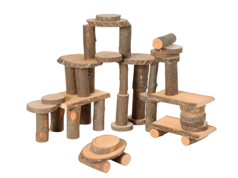 Welke grote dingen kunnen worden gebouwd van de kleine boomstammen, vierkante platen en ronde schijven? Hier is de bereidheid van de kinderen om te experimenteren, ideeën te ontwikkelen en tact vereist. Boomstammen en platen hebben dezelfde lengte, zodat ze gemakkelijk kunnen worden gestapeld en geïnstalleerd - ondanks de natuurlijke vorm van het hout. Elke bouwsteen is uniek en de ruwe schors biedt een bijzonder haptische ervaring wanneer deze wordt vastgepakt.