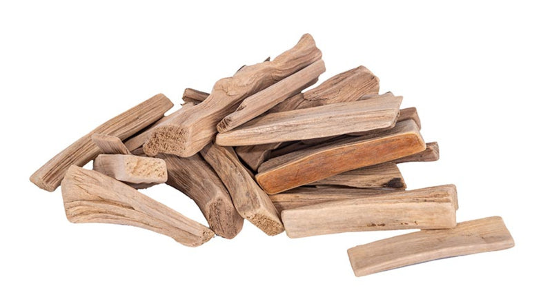 Zak met verschillende stukjes knutselhoutjes in verschillende vormen en maten.