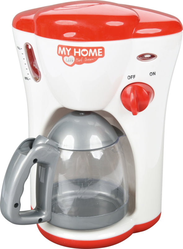 Gemaakt van plastic. Waterkoker inbegrepen. Het apparaat maakt een geluid en licht op (aan de rechterkant bevindt zich een AAN / UIT-knop).