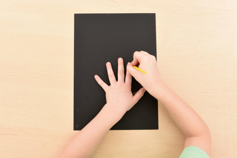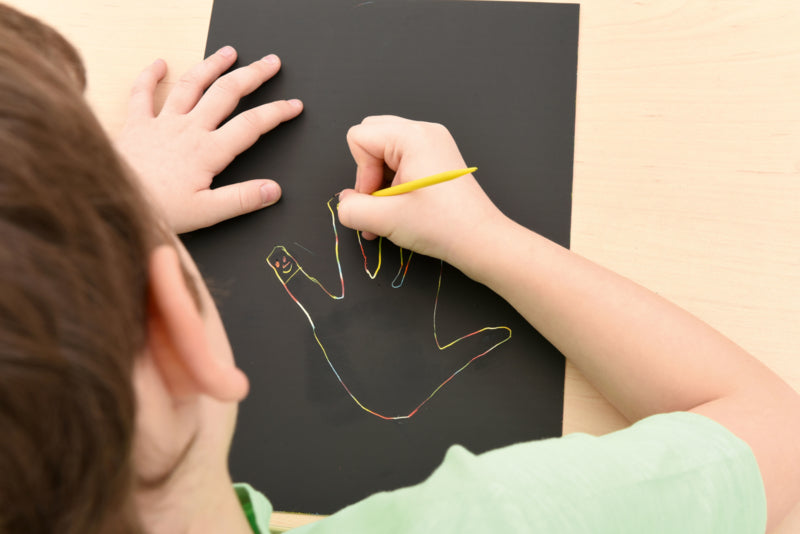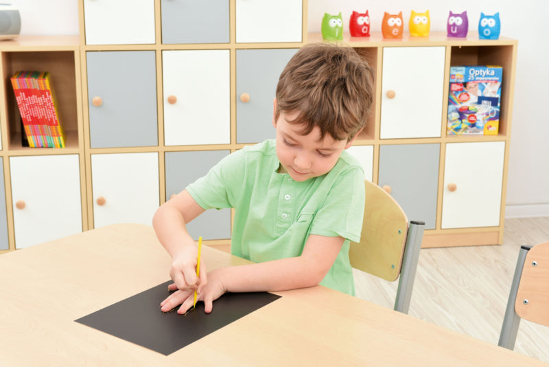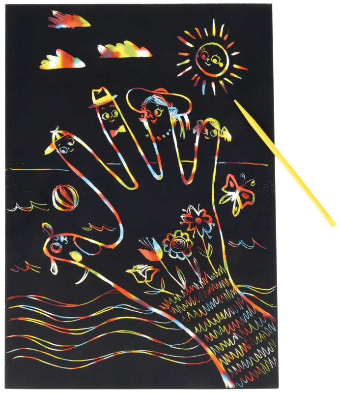 Dik, sterk karton voor krab tekeningen. Onder de bovenste zwarte laag verschijnt een kleurrijke achtergrond. Bedekt met niet-giftige verf.