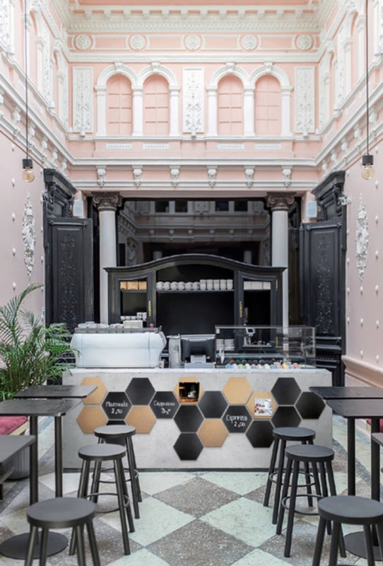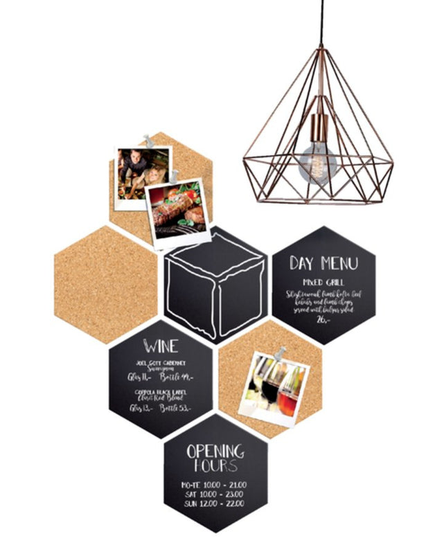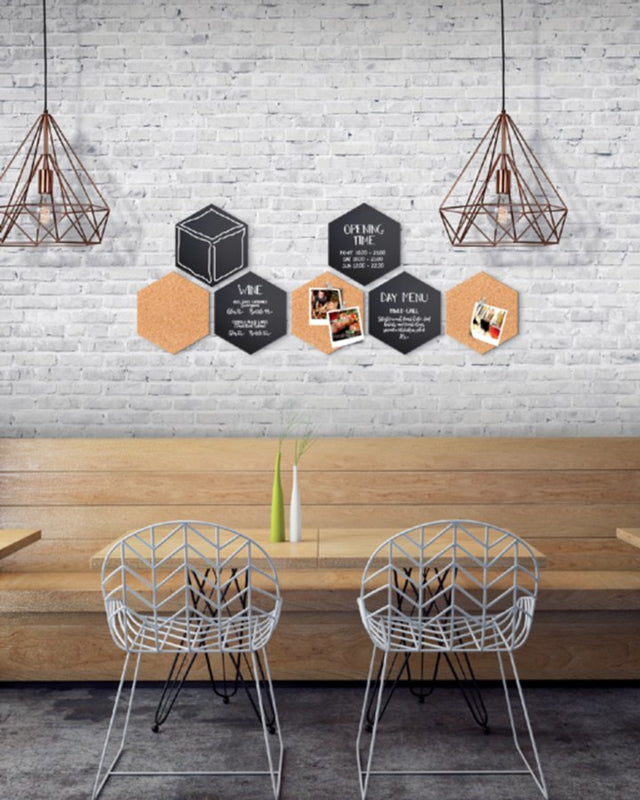 - Met deze zeskantige prik- en krijtborden kan er een decoratief decor ontstaan in de keuken, werkkamer of slaapkamer.