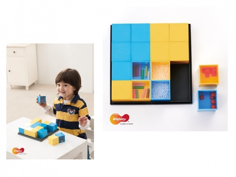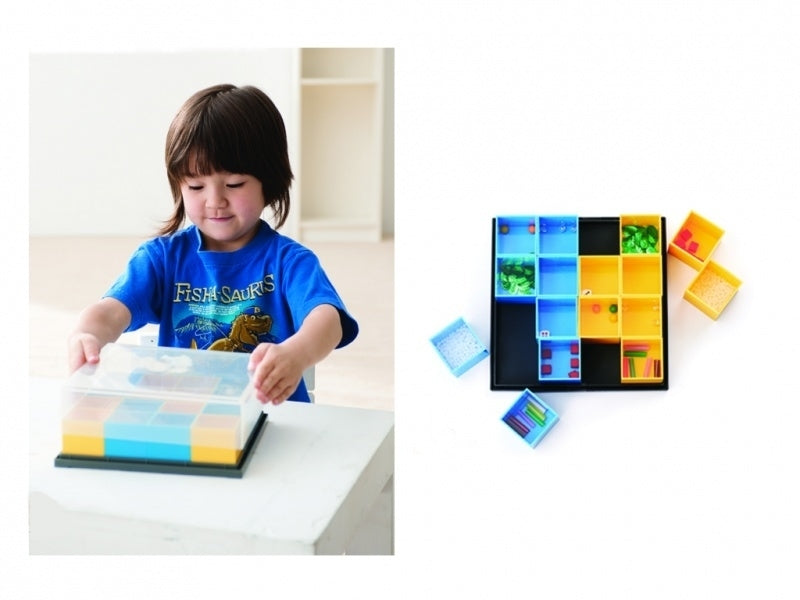 Bewaardoos met 16 blokken van 5 x 5 x 5 cm. van kunststof met plexiglas.