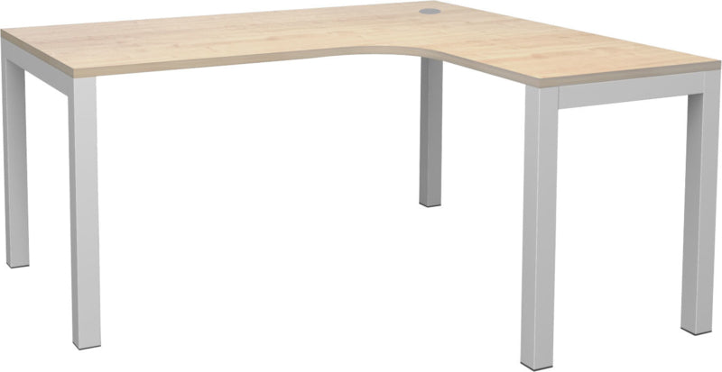 Bureau tafel op metalen constructie, aluminium kleurig. Het frame heeft verstelbare poten. De poten kunnen de tafel waterpas maken tot 25 mm. Tafelblad van gelamineerd spaanplaat in een esdoorn kleur (dikte 25 mm.), met randafwerking (dikte 2 mm.).