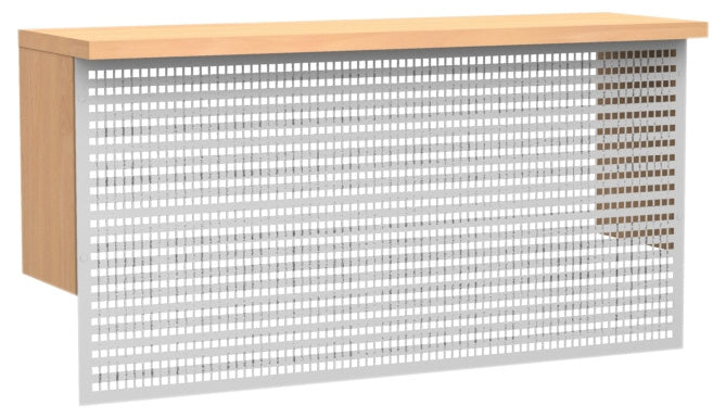 Paneel gemaakt van gelamineerd spaanplaat (dikte: 25 mm) in een esdoorn kleur, met alu opengewerkte geperforeerde voorkant.