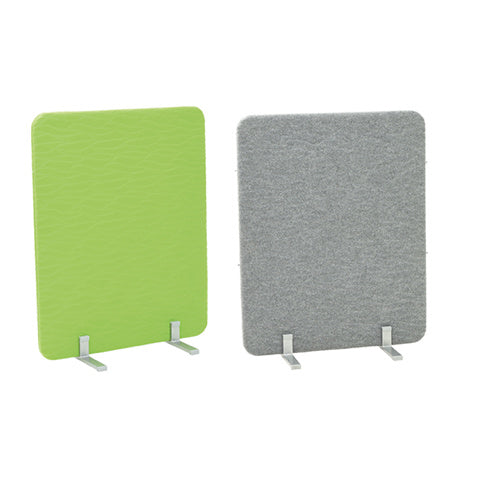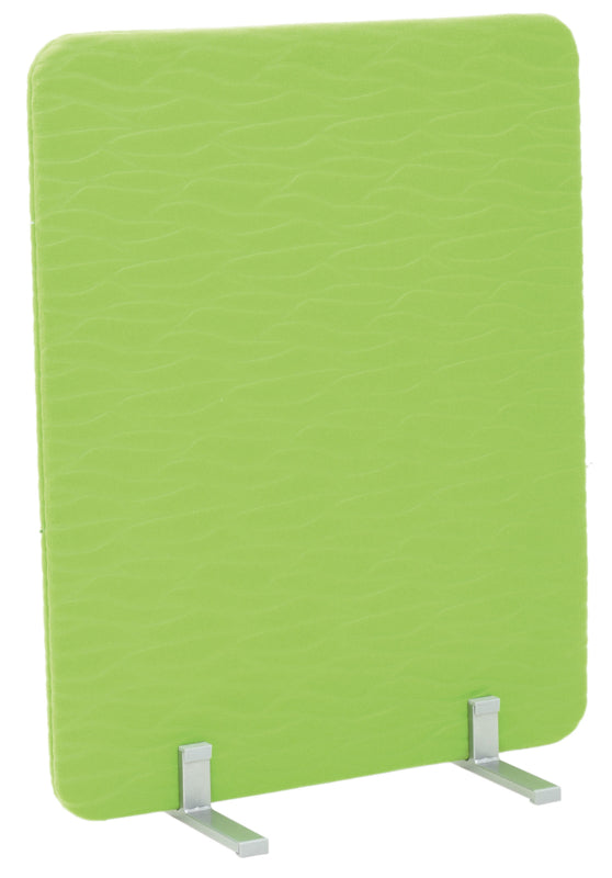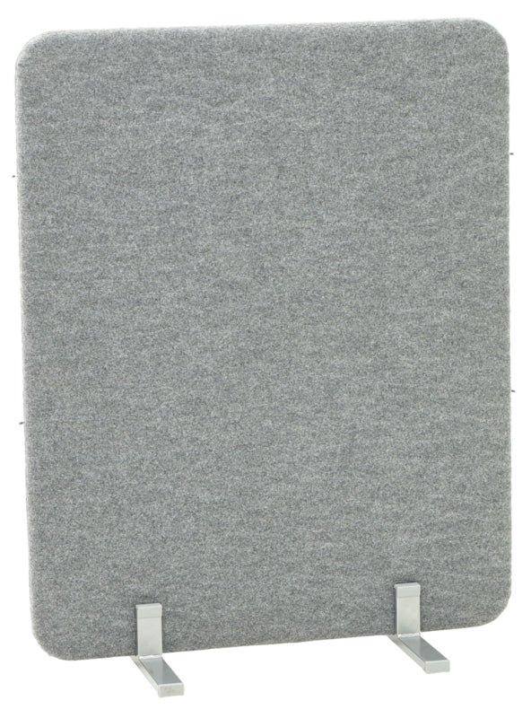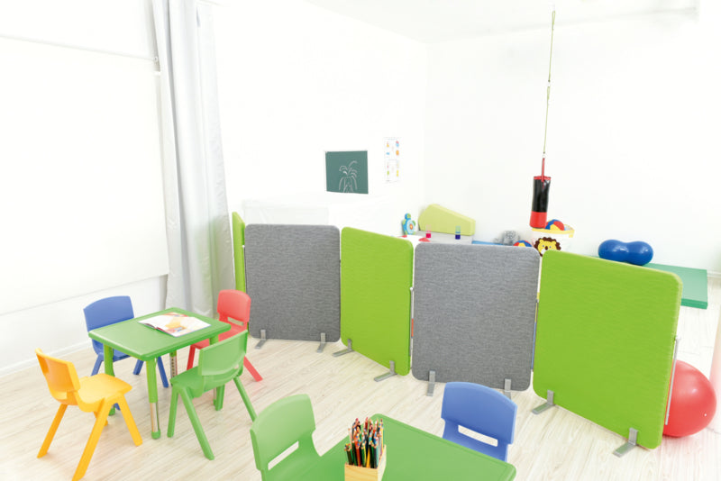 Geluiddempende schermen met een stijf frame bedekt met textiel, geplaatst op aluminium steunen. De mogelijkheid bestaat om meerdere schermen onder verschillende hoeken te combineren.