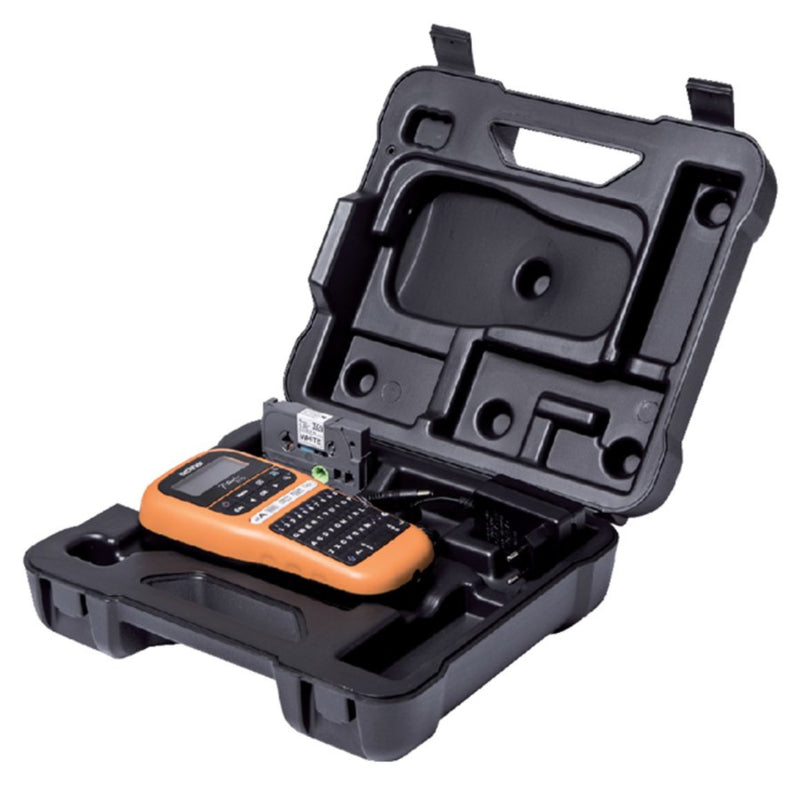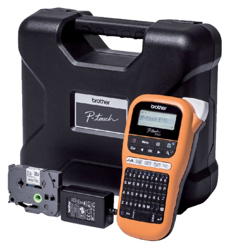 - De labelprinter wordt standaard geleverd met een AC adapter en een flexible-ID TZe tapecassette van 9 mm in een stevige, handige draagkoffer, zodat u dit alles gemakkelijk kunt meenemen naar de volgende klus.
