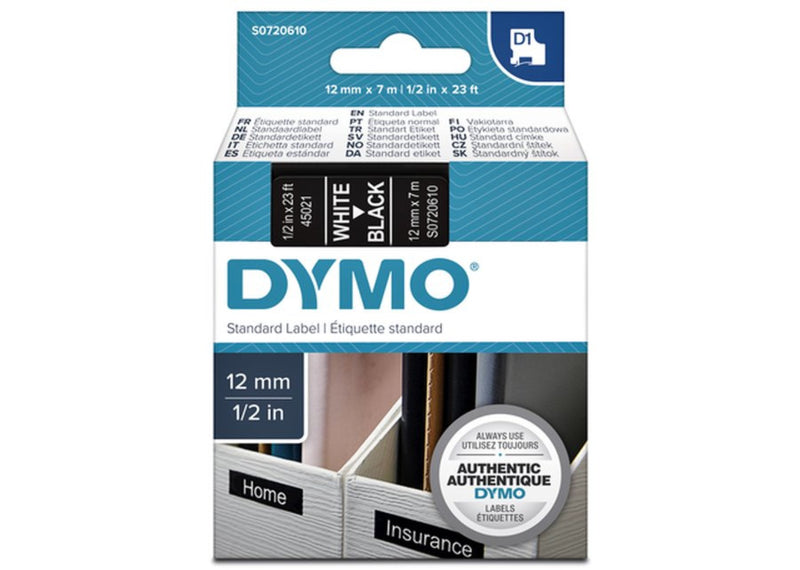 Labeltape Dymo 45021 D1 720610 12mmx7m wit op zwart