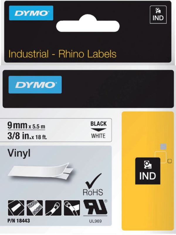 Labeltape Dymo Rhino 18443 vinyl 9mmx5.5m zwart op wit