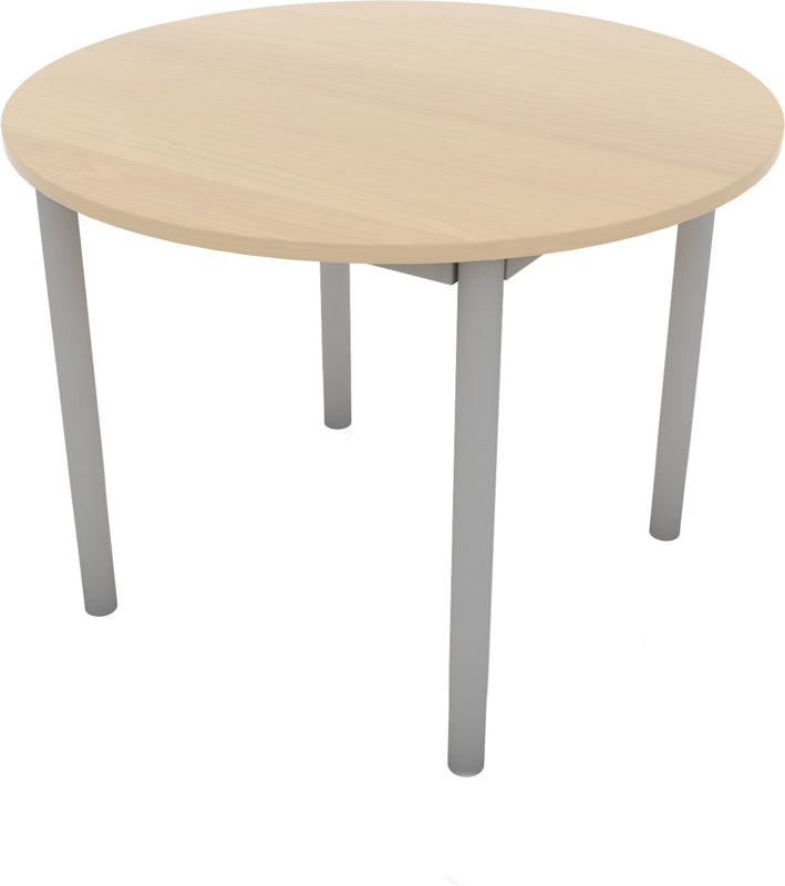 Koffietafel met tafelblad van gelamineerd spaanplaat in een esdoorn of beuken kleur, met metalen frame en ronde poten.