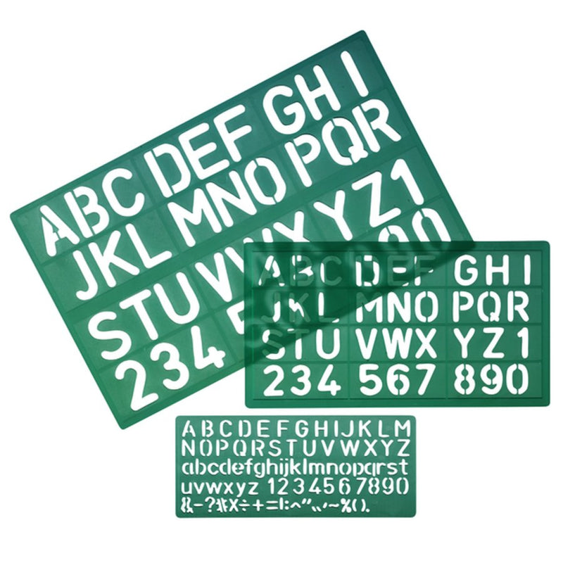 - Set bestaande uit 10 mm, 20 mm en 30 mm sjablonen met hoofdletters, cijfers en symbolen.