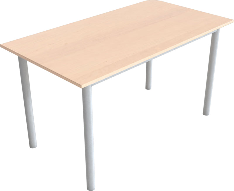 Vergadertafel met tafelblad van gelamineerd spaanplaat in een esdoorn / beuken kleur, met metalen frame en ronde poten.