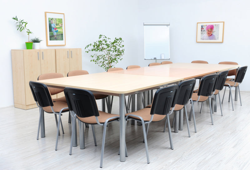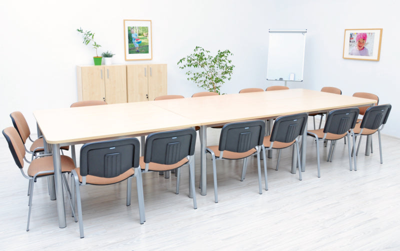 Vergadertafel met tafelblad van gelamineerd spaanplaat in een esdoorn / beuken kleur, met metalen frame en ronde poten.