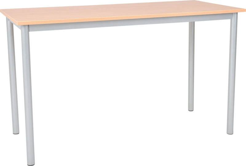 Tafel op metalen frame, met ronde poten. Tafelblad van gelamineerd spaanplaat in een beuken kleur (dikte: 18 mm).