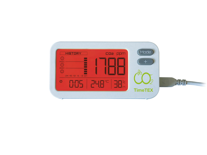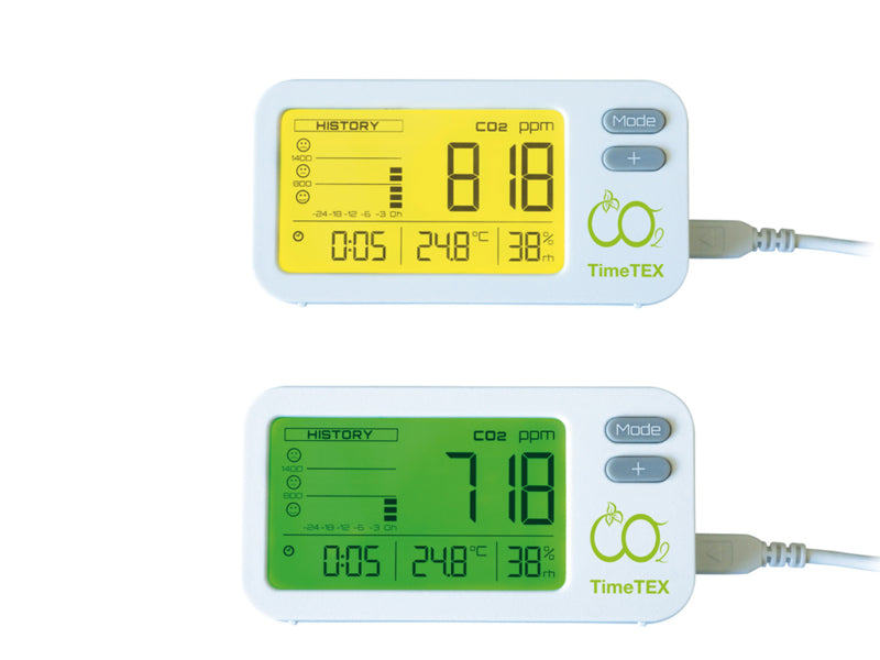 Frisse lucht in gesloten ruimtes is belangrijk voor de concentratie, voor een goede nachtrust en minimaliseert het risico op infectie via virusrijke aerosolen. De meter bewaakt de CO2-concentratie binnenshuis, de kamertemperatuur en de luchtvochtigheid. De displayverlichting in stoplichtkleuren laat in één oogopslag zien of de CO2-waarde in het groene bereik ligt of dat er actie moet worden ondernomen. Voor de afgelopen 24 uur wordt een geschiedenis van gemiddelden weergegeven. Het display kan worden bediend met alarmfunctie, permanente of uitgeschakelde verlichting.