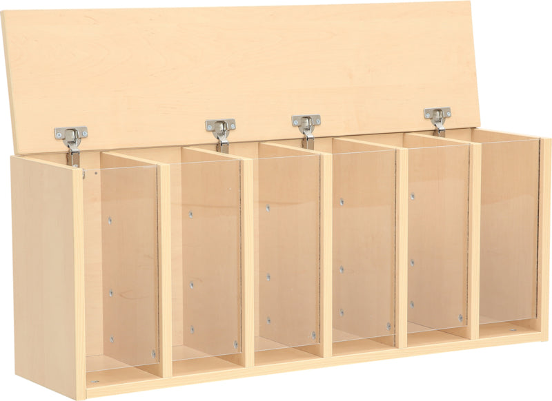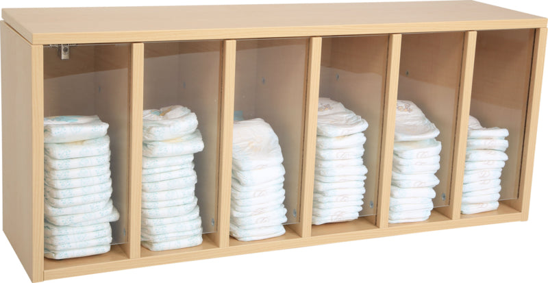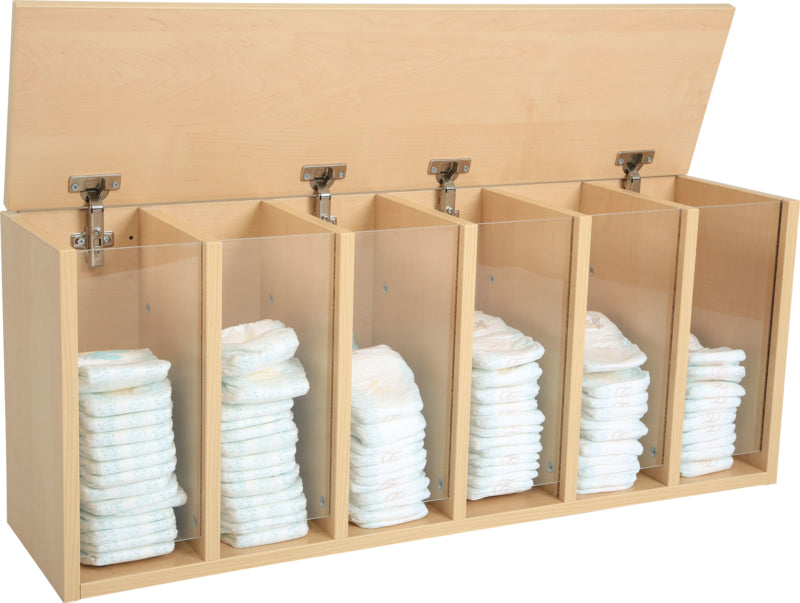 Praktisch meubel met 6 compartimenten voor luiers, om aan een muur te hangen. Ca. 20 luiers passen in elk compartiment. De voorkant is gemaakt van plexi, zodat luiers er niet uitvallen, maar het is zichtbaar hoeveel er nog zijn. Plexi-wand heeft 2,5 cm dikke sleuven in elk compartiment, dus het is gemakkelijk om de luier uit te nemen. Beweegbaar bovenpaneel, met scheidingswand en zachtsluitende scharnieren (wat voorkomt dat vingers bekneld raken). Na het sluiten kan het bovenste paneel als plank worden gebruikt. Gemaakt van gelamineerd spaanplaat (dikte: 18 mm) in een esdoorn kleur.