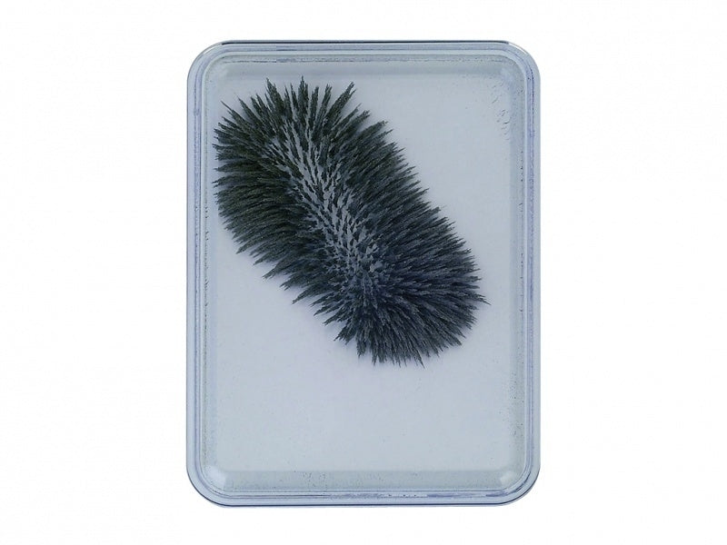 Zodra de magneet aan de onderzijde van het doosje gaat, richt het ijzerpulver zich op.