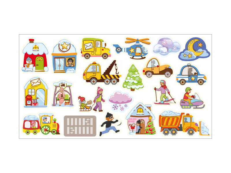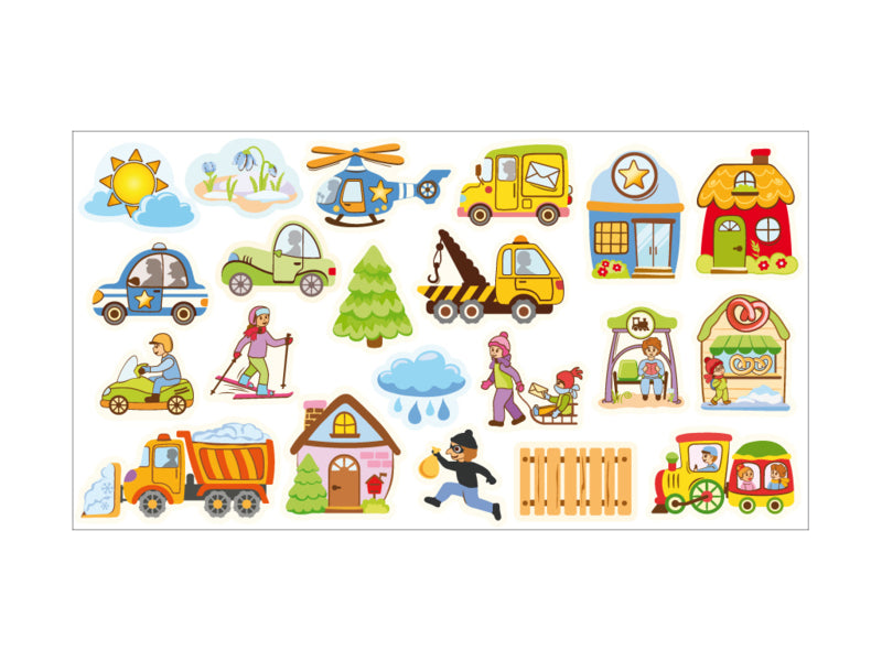 Voertuigen, gebouwen, mensen, dieren, planten en vele andere figuren die aan beide zijden zijn afgedrukt, vullen de magneetborden (niet inbegrepen) met leven en plezier. Met prachtig getekende details kunnen fantasierijke verhalen worden verteld en nieuwe kennis worden overgedragen.