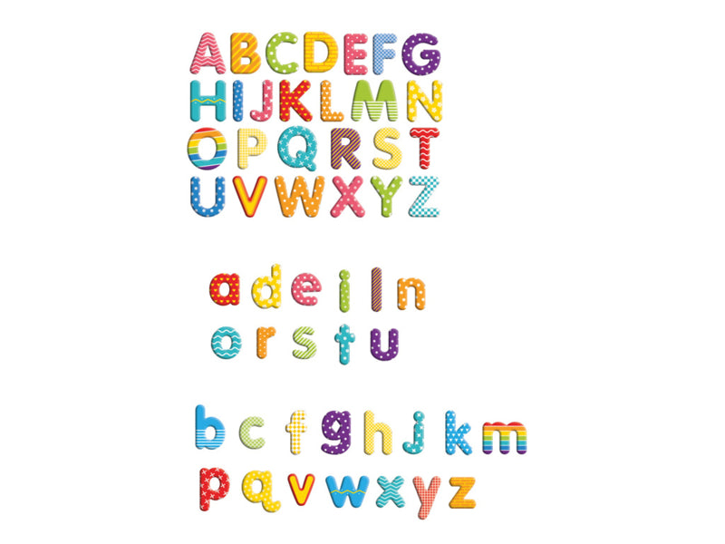 Magnetische letters met vrolijke patronen.