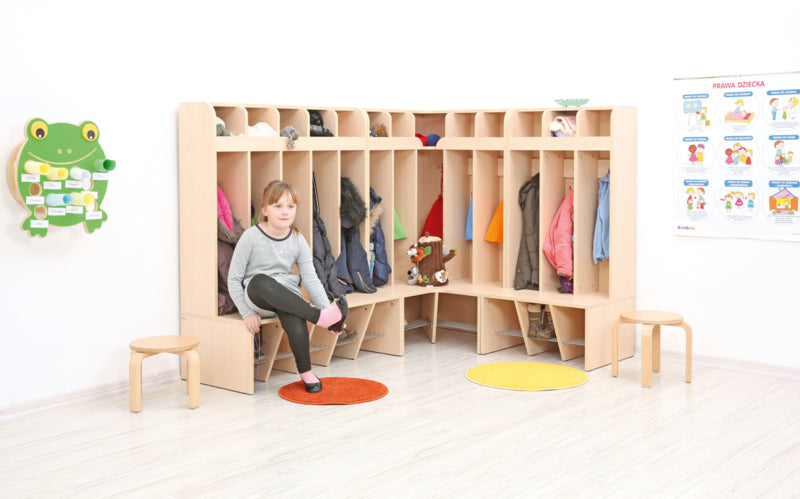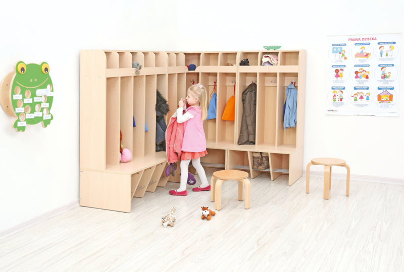Garderobe gemaakt van gelamineerd spaanplaat in een esdoorn kleur en met haken voor kleding en zakken. Uitgerust met plank voor tassen of schoolspullen. Met mogelijkheid om een naam te plakken. Met open schoenenrek onder waardoor het schoonmaken eenvoudig is. De garderobe kan worden uitgerust met deuren (92960 - 92965, 100831 en 100957).