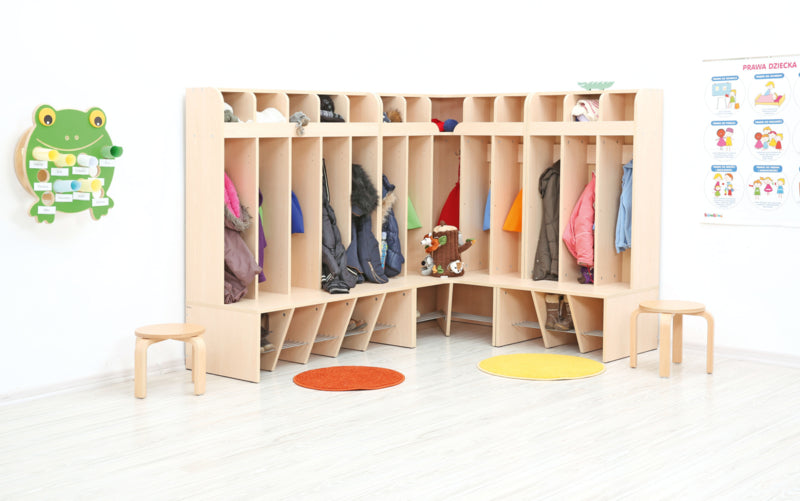 Garderobe gemaakt van gelamineerd spaanplaat in een esdoorn kleur en met haken voor kleding en zakken. Uitgerust met plank voor tassen of schoolspullen. Met mogelijkheid om een naam te plakken. Met open schoenenrek onder waardoor het schoonmaken eenvoudig is. De garderobe kan worden uitgerust met deuren (92960 - 92965, 100831 en 100957).