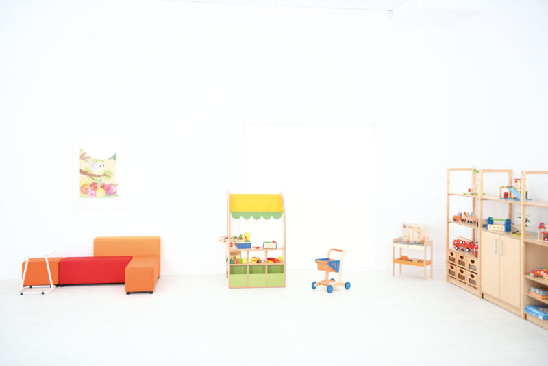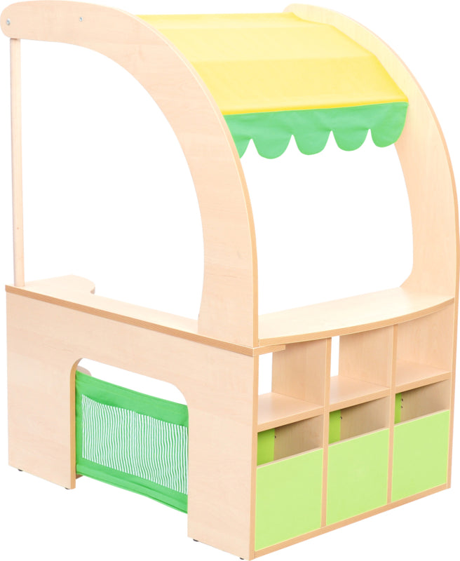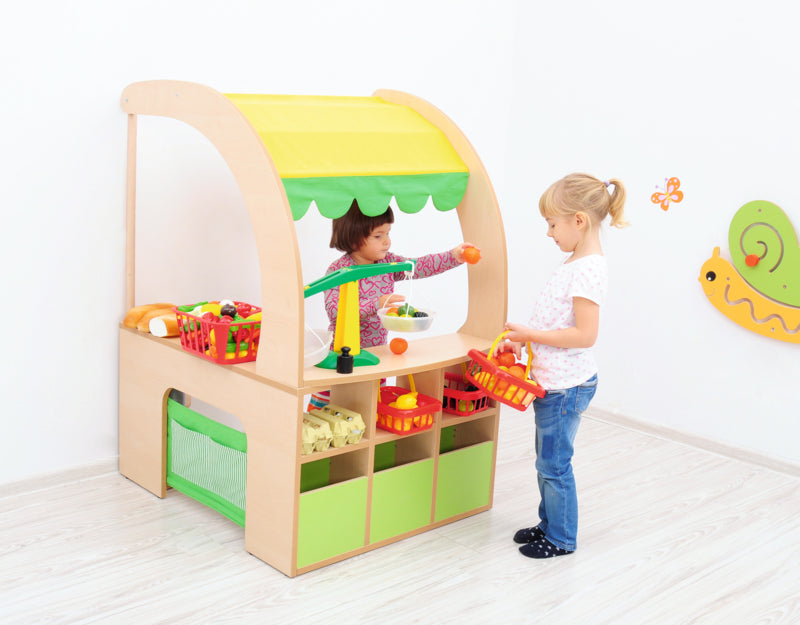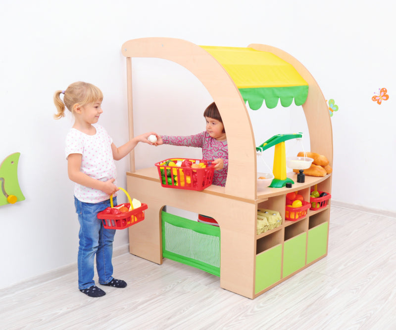 deze marktkraam is er om het bootschapen doen na te spelen,wat groepsintegratie ontwikkelt. Kinderen communiceren en werken samen tijdens dit fanasiespel.
