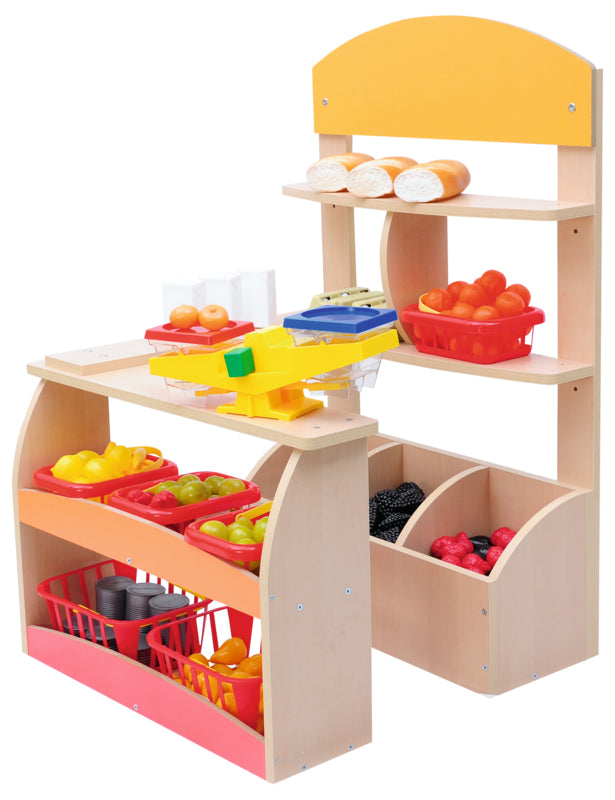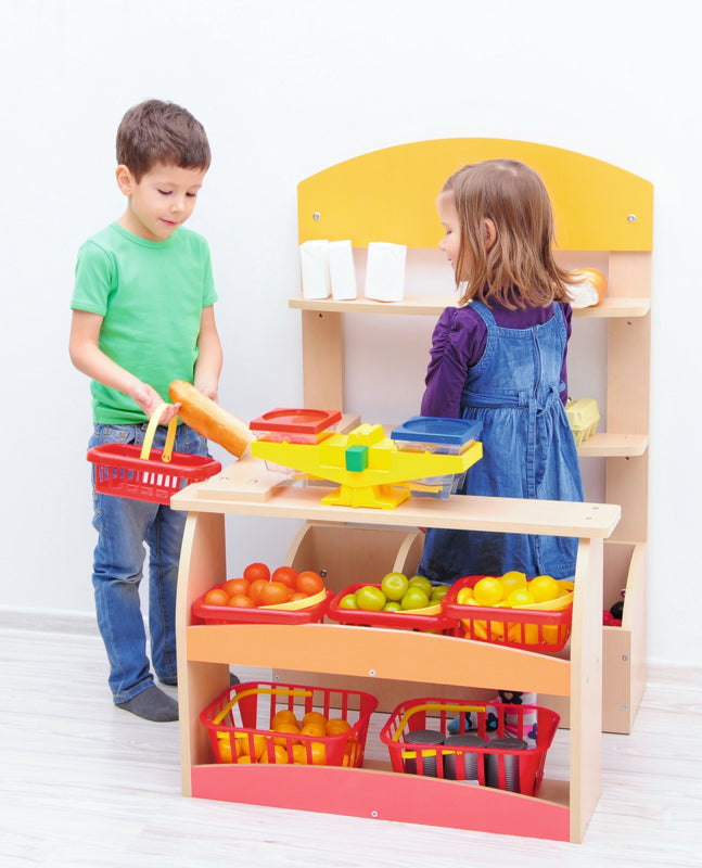 deze marktkraam is er om het bootschapen doen na te spelen,wat groepsintegratie ontwikkelt. Kinderen communiceren en werken samen tijdens dit fanasiespel.