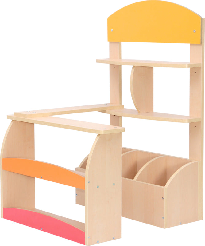 Kraam gemaakt van gelamineerd spaanplaat in een esdoorn kleur met kleurrijke MDF-plaatelementen. Voorzien van 3 vakken en planken aan de achterkant, en 2 planken en aan de voorkant.