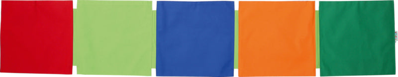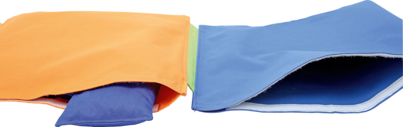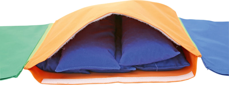 Kleurrijke katoenen mat met 5 zakken met klittenband. Het is mogelijk om ze te vullen met verschillende materialen (bonen, folie, kralen, schuim).