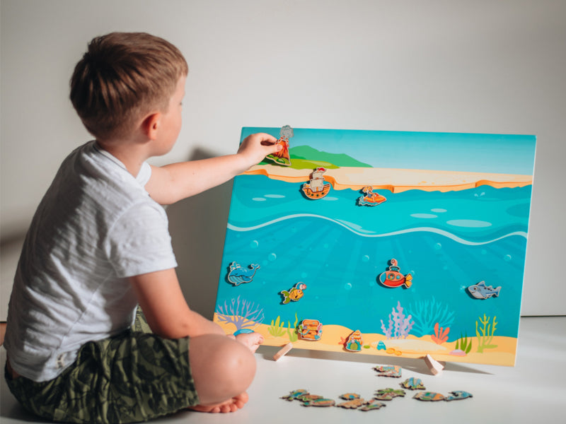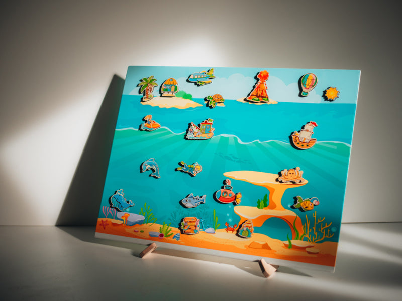 Rond de zee, in besneeuwde winterlandschappen, in de stad en op het platteland kunnen de bijpassende magnetische figuren vrij worden geplaatst. Kinderen van verschillende leeftijdsgroepen worden zo spelenderwijs ondersteund in hun kennis- en taalontwikkeling: van het leren kennen van nieuwe termen tot het vertellen van verhalen.