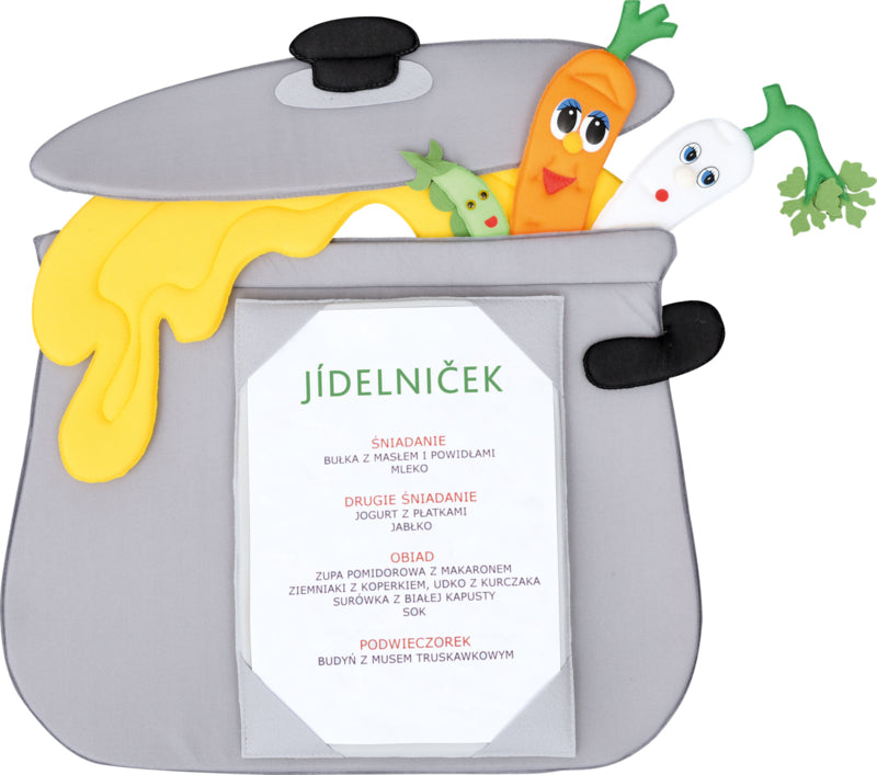Textiel wandbord in de vorm van een pot met groenten, waarop een menu kan worden bevestigd voor de huidige dag of week in school