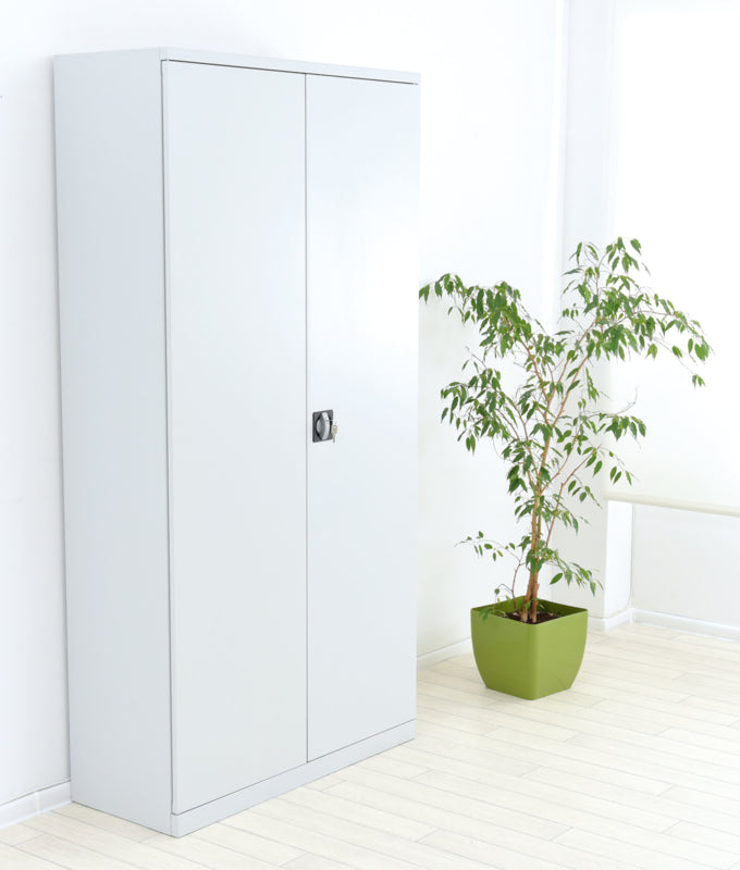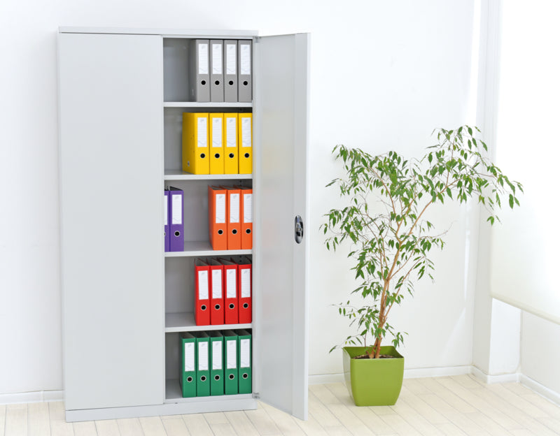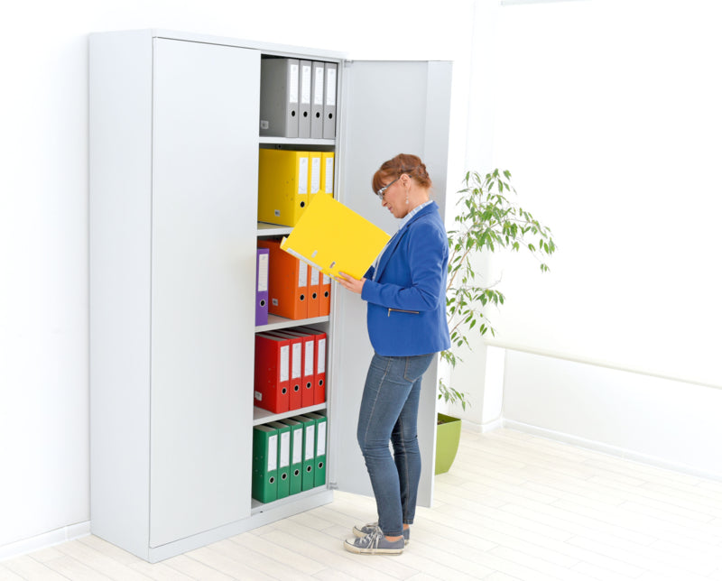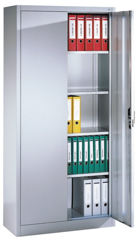 Metalen kast voor documenten met verstelbare planken. De deuren zijn uitgerust met cilindrische vergrendeling, aan de binnenkant versterkt met een metalen profiel.
