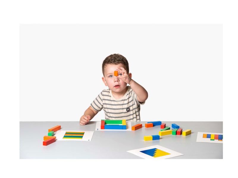 Inhoud: Instructies, 25 blokken in 5 lengtes en 5 kleuren, 4 oefenkaarten uit de doos (= 8 taken).