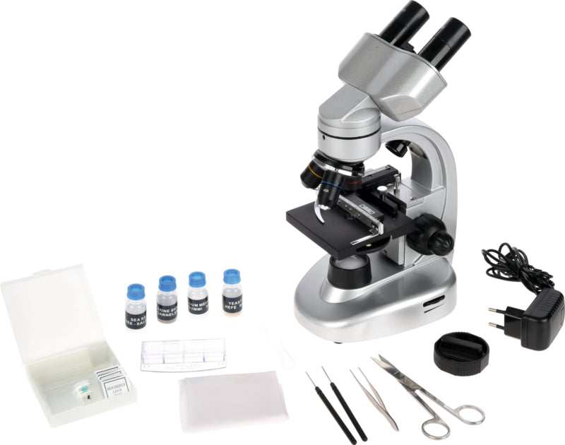 Optische microscoop voor dagelijks gebruik in het biologische laboratorium. Netvoeding. Uitgerust met een dubbel verlichtingssysteem met vloeiende regeling van de helderheid van passerend en gereflecteerd licht. Zoombereik van 40 tot 400. Verrekijkerskop onder een hoek van 45 °, 360 ° gedraaid. Tabel voor specimen met een kruishandvat en een speciale schaal voor betere leesbaarheid.