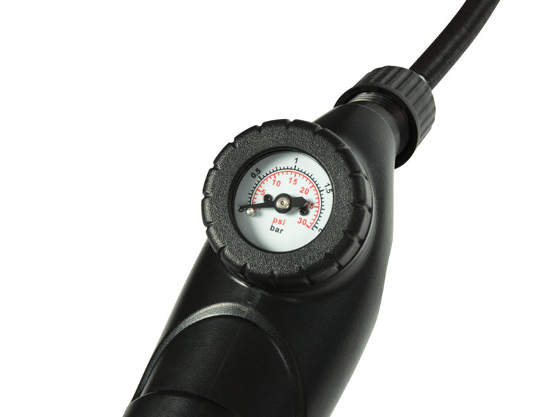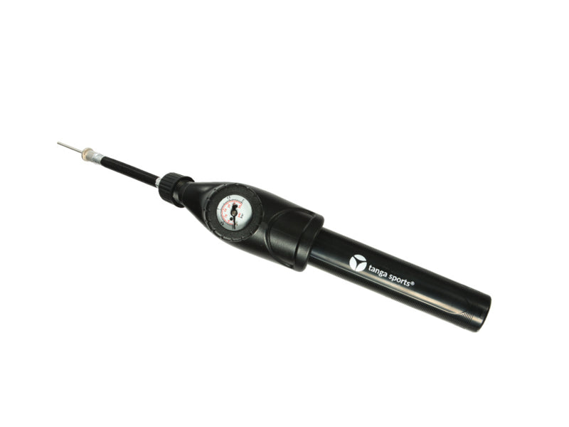 Met de compacte handpomp kunnen ballen gecontroleerd worden gevuld: de manometer toont de luchtdruk tot 2 bar. Het pompproces vindt in beide richtingen plaats. De slang en naaldklep kunnen worden losgeschroefd.