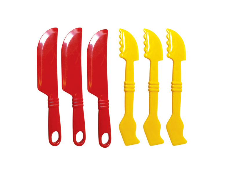 3 plastic spatels met twee uiteinden en 3 kunststof modelleermessen. Deze gereedschappen kunnen worden gebruikt voor het snijden, vormen en markeren van klei. De gereedschappen zijn speciaal ontworpen voor kinderen zodat ze veilig kunnen oefenen met snijden.