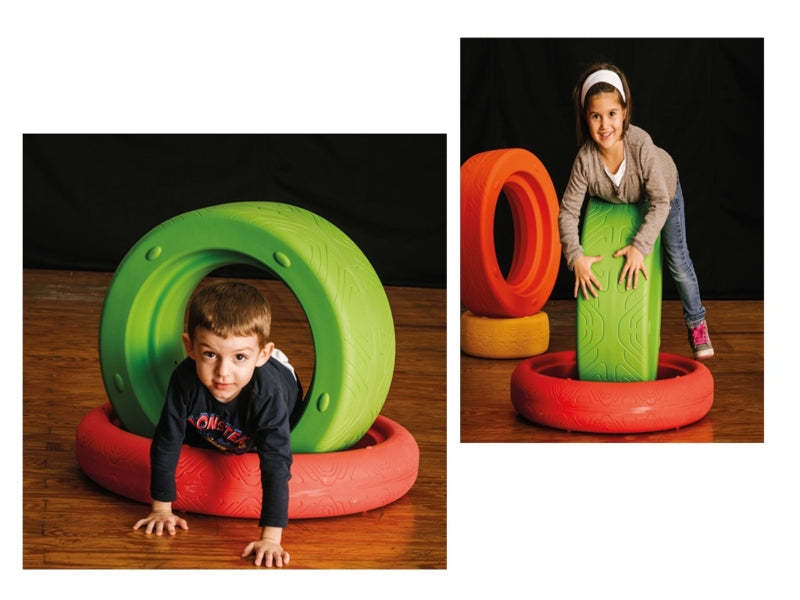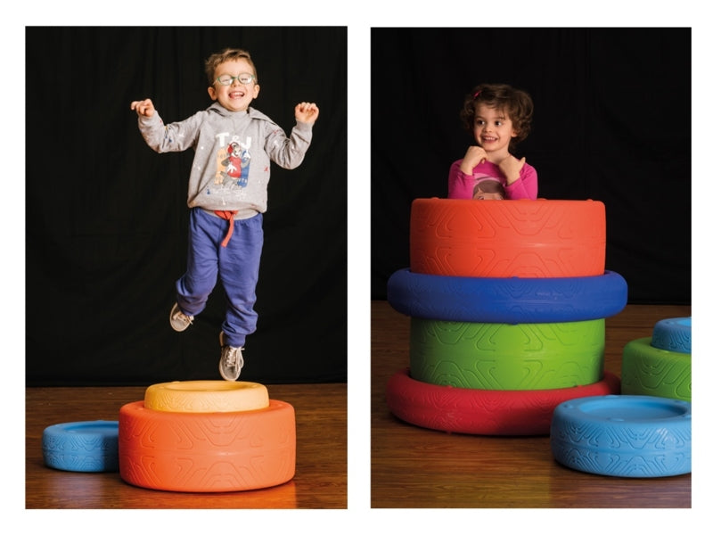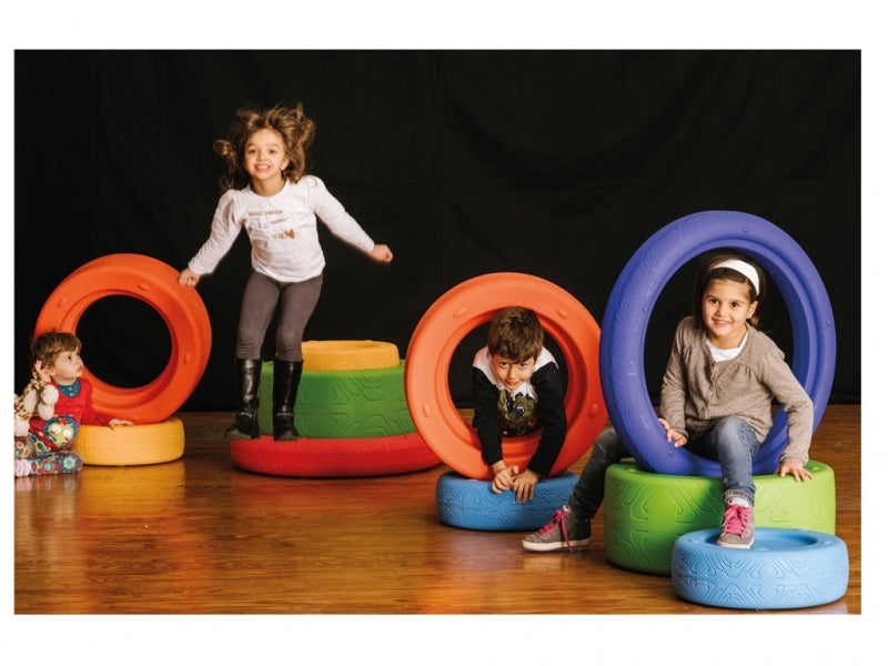De motorische hoepels in verschillende maten en kleuren bieden tal van speel- en klimmogelijkheden: springen, rollen, balanceren, inspringen en doorklimmen. De kinderen kunnen zich gericht uitleven of hun motoriek verbeteren. De banden kunnen worden gecombineerd: elk wiel past in een ander voor eenvoudige opstelling als een parcours en stapelbaar: voor ruimtebesparende opslag.